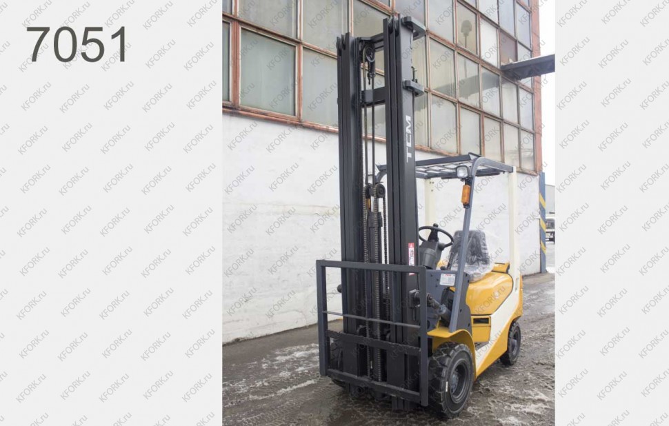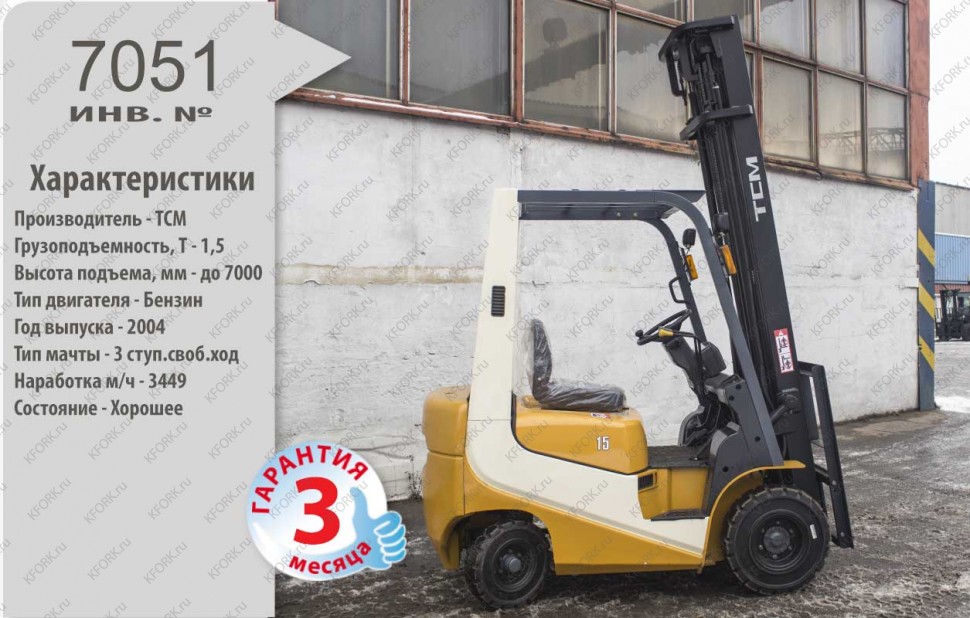 Бензиновый автопогрузчик TCM Б/У с интентарным номером 7051 2004 года выпуска. Состояние - Хорошее. Имеет грузоподъемность 1500 кг. Гарантия: 3 мес или 500 м/час.