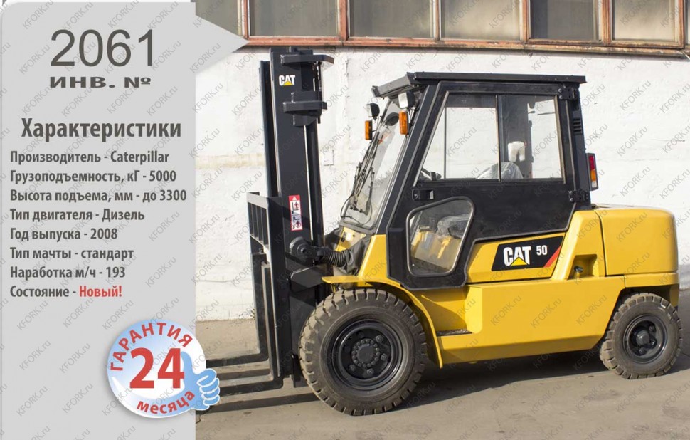 Дизельный автопогрузчик Caterpillar Б/У с интентарным номером 2061 2008 года выпуска. Состояние - Хорошее. Имеет грузоподъемность 5000 кг. Гарантия: 2 года или 2000 м/час.