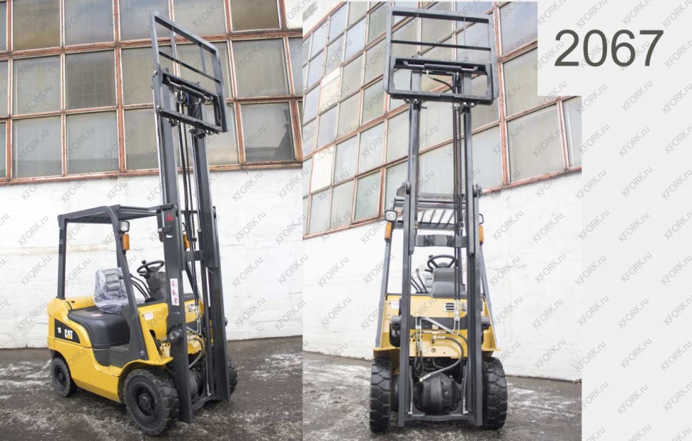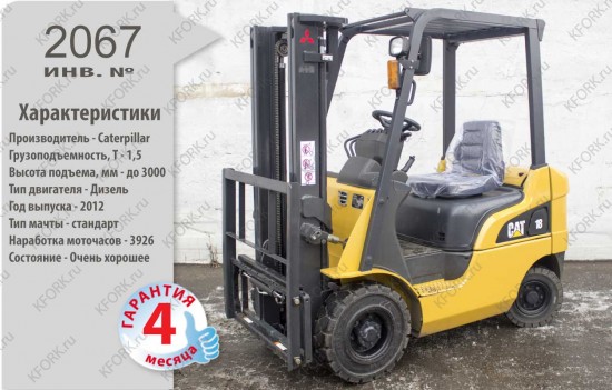 Дизельный автопогрузчик Caterpillar Б/У с интентарным номером 2067 2012 года выпуска. Состояние - Хорошее. Имеет грузоподъемность 1500 кг. Гарантия: 4 мес или 500 м/час.