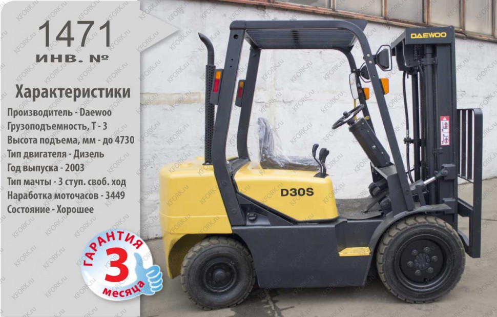 Дизельный автопогрузчик Daewoo Б/У с интентарным номером 1471 2003 года выпуска. Состояние - Хорошее. Имеет грузоподъемность 3000 кг. Гарантия: 3 мес или 500 м/час.