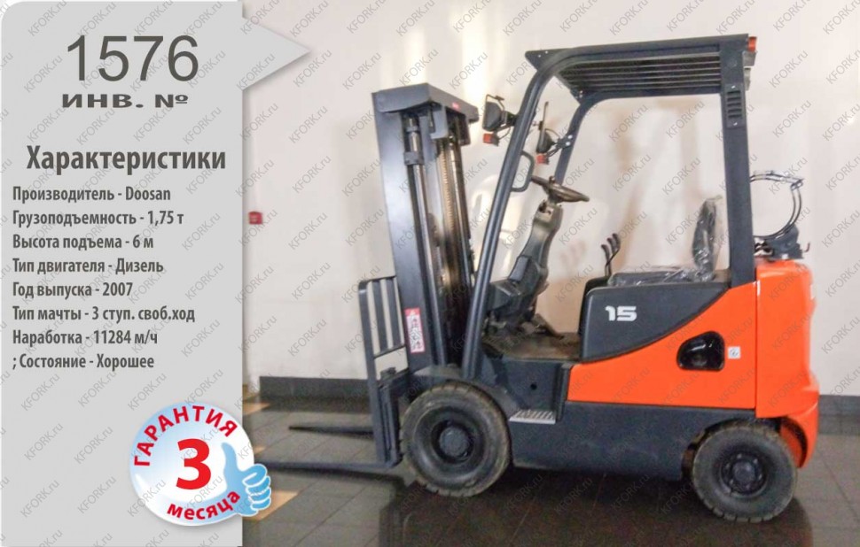 Дизельный автопогрузчик Doosan Б/У с интентарным номером 1576 2007 года выпуска. Состояние - Хорошее. Имеет грузоподъемность 1750 кг. Гарантия: 3 мес или 500 м/час.