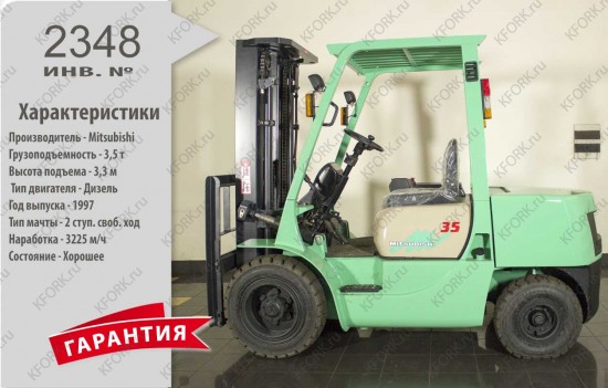 Дизельный автопогрузчик Mitsubishi Б/У с интентарным номером 2348 1997 года выпуска. Состояние - Хорошее. Имеет грузоподъемность 3500 кг. Гарантия: 1 мес или 200 м/час.