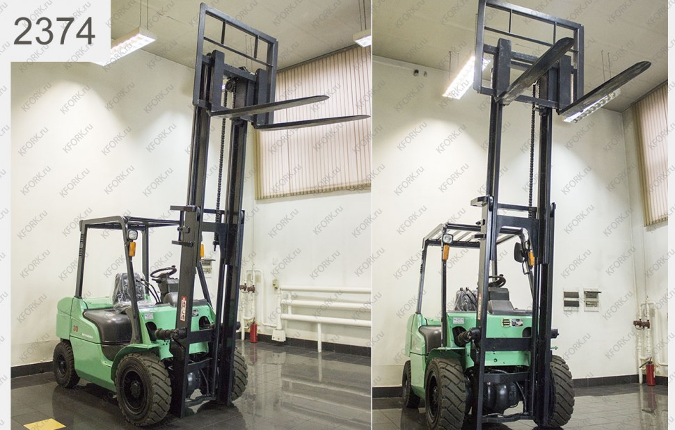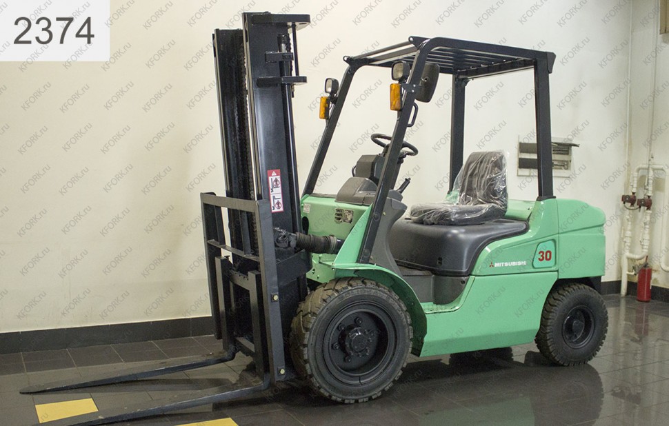Дизельный автопогрузчик Mitsubishi Б/У с интентарным номером 2374 2008 года выпуска. Состояние - Хорошее. Имеет грузоподъемность 3000 кг. Гарантия: 3 мес или 500 м/час.
