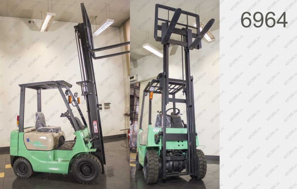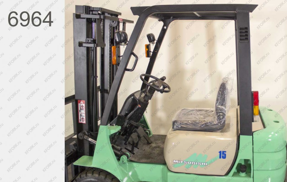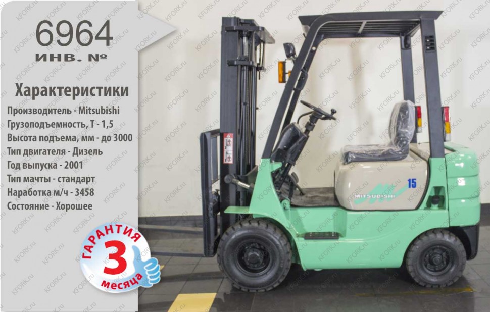 Дизельный автопогрузчик Mitsubishi Б/У с интентарным номером 6964 2001 года выпуска. Состояние - Отличное. Имеет грузоподъемность 1500 кг. Гарантия: 3 мес или 500 м/час.