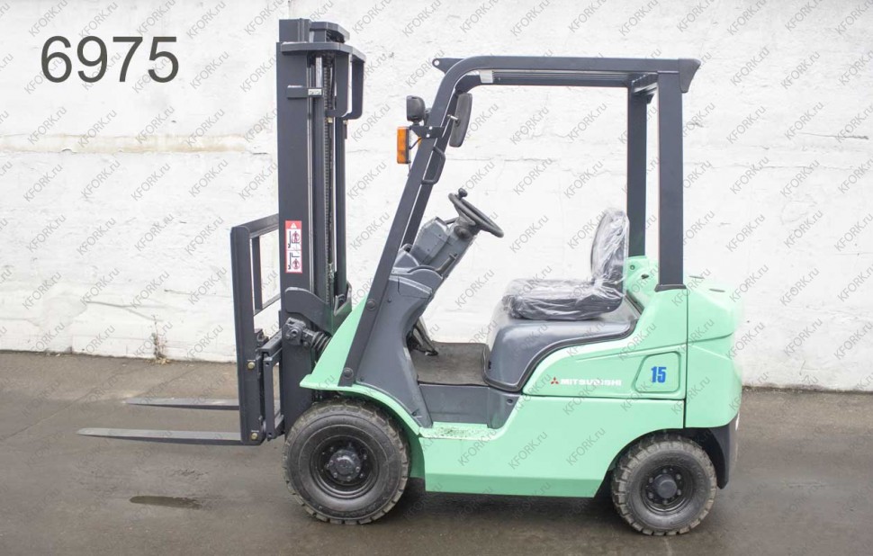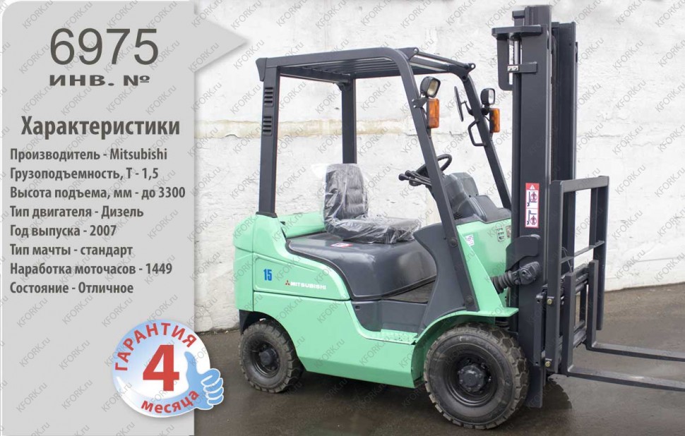 Дизельный автопогрузчик Mitsubishi Б/У с интентарным номером 6975 2007 года выпуска. Состояние - Хорошее. Имеет грузоподъемность 1500 кг. Гарантия: 4 мес или 500 м/час.