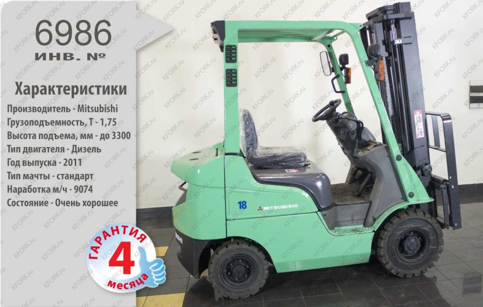Дизельный автопогрузчик Mitsubishi Б/У с интентарным номером 6986 2011 года выпуска. Состояние - Хорошее. Имеет грузоподъемность 1750 кг. Гарантия: 4 мес или 500 м/час.