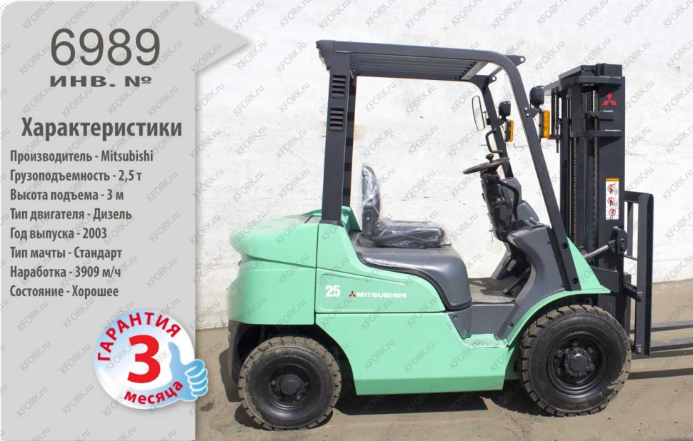 Дизельный автопогрузчик Mitsubishi Б/У с интентарным номером 6989 2003 года выпуска. Состояние - Хорошее. Имеет грузоподъемность 2500 кг. Гарантия: 3 мес или 500 м/час.