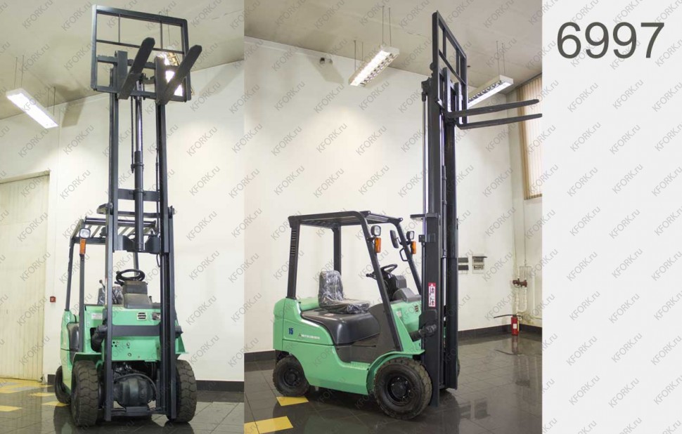 Дизельный автопогрузчик Mitsubishi Б/У с интентарным номером 6997 2007 года выпуска. Состояние - Отличное. Имеет грузоподъемность 1500 кг. Гарантия: 6 мес или 800 м/час.
