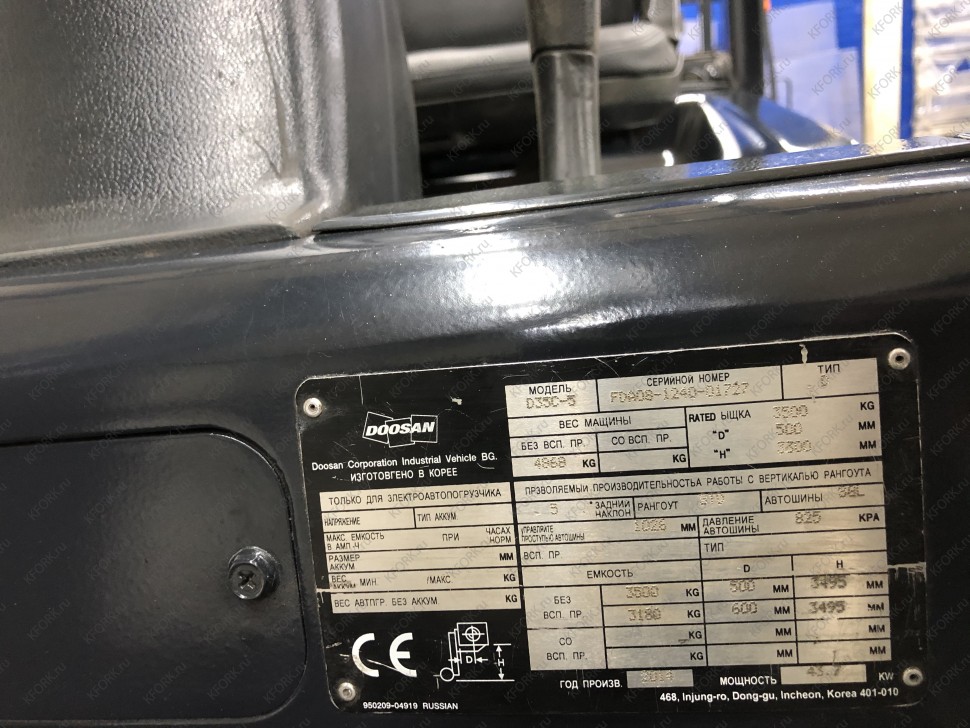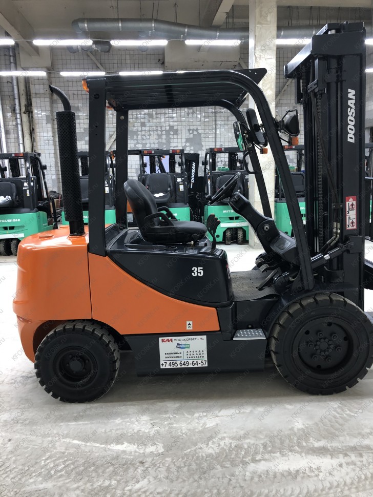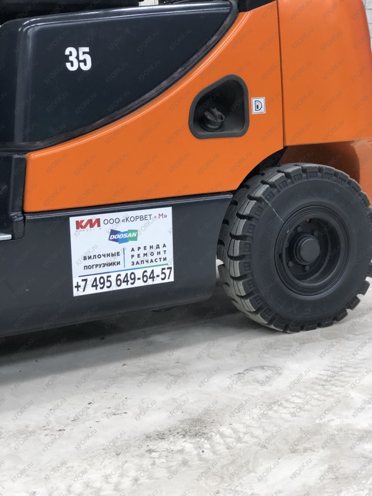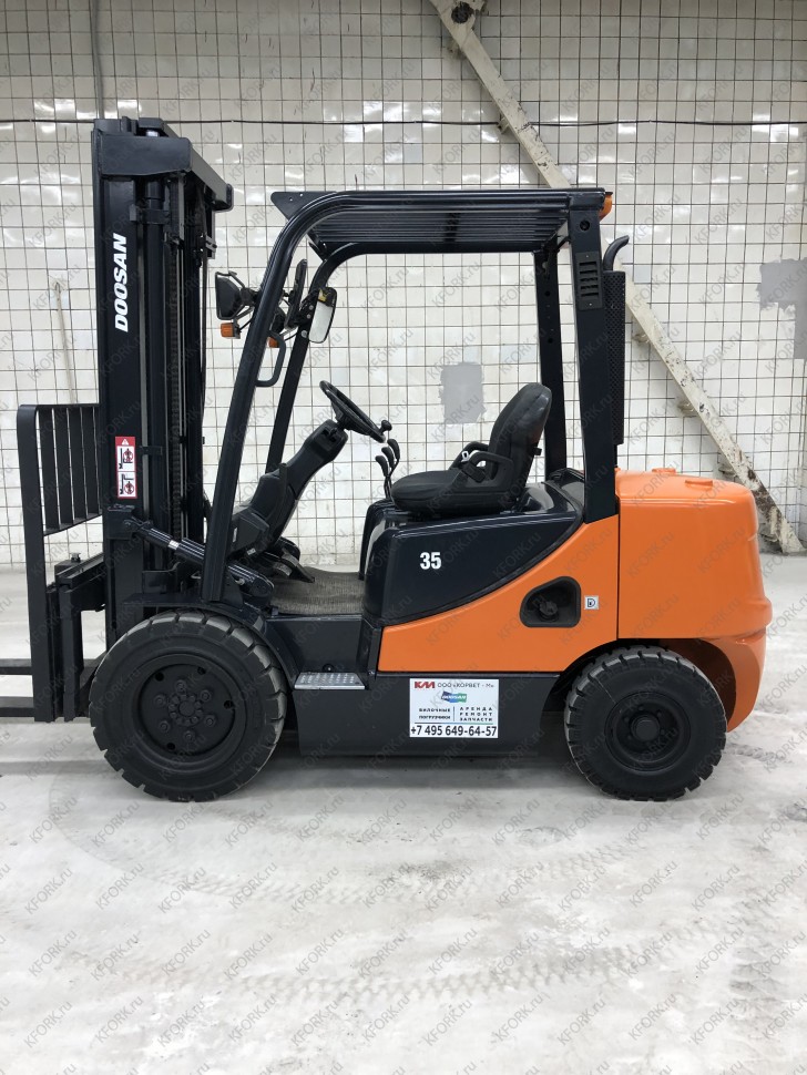 Дизельный автопогрузчик Doosan D35C-5 с инвентарным номером КМ078 2014 года выпуска. Имеет грузоподъемность 3500 кг. Гарантия: 3 мес или 500 м/час.