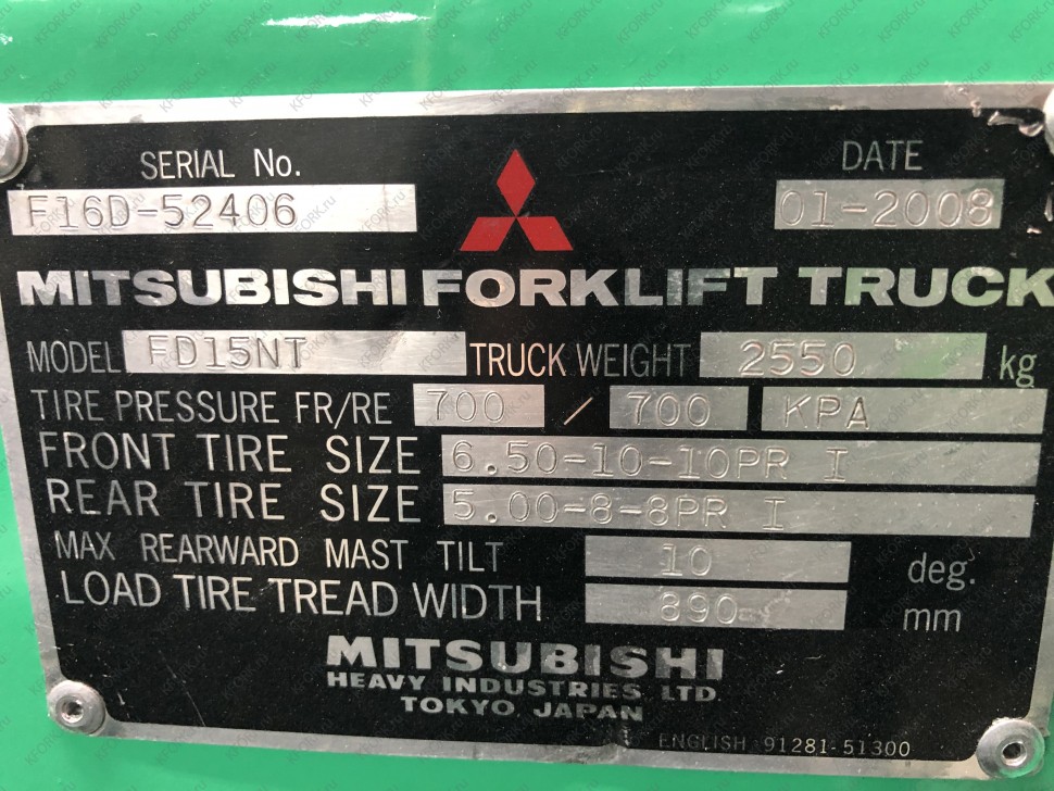 Дизельный автопогрузчик Mitsubishi FD15NT с инвентарным номером КМ073 2008 года выпуска. Имеет грузоподъемность 1500 кг. Гарантия: 3 мес или 500 м/час.