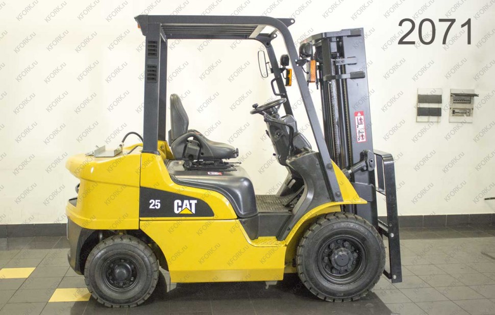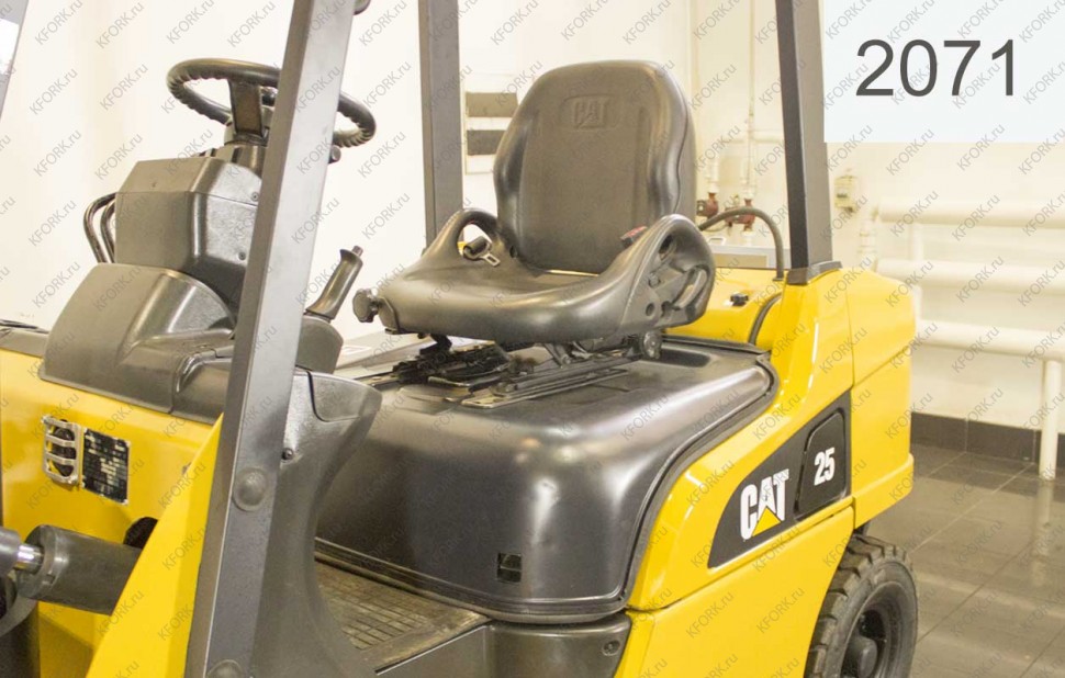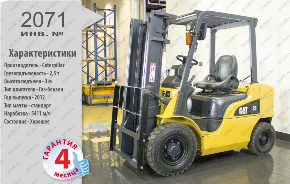 Газ-Бензиновый автопогрузчик Caterpillar Б/У с интентарным номером 2071 2012 года выпуска. Состояние - Хорошее. Имеет грузоподъемность 2500 кг. Гарантия: 4 мес или 500 м/час.