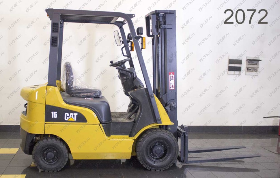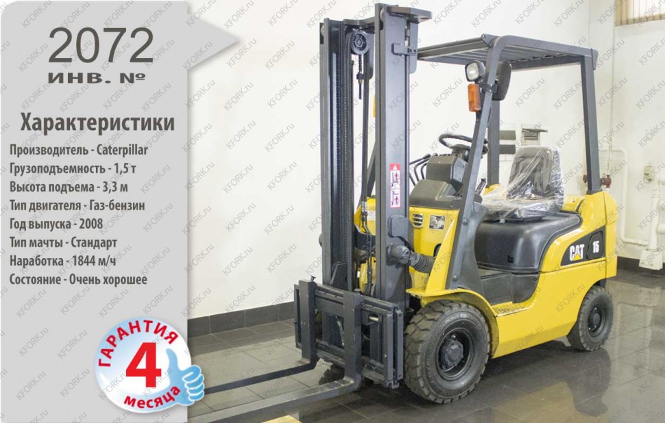 Газ-Бензиновый автопогрузчик Caterpillar Б/У с интентарным номером 2072 2008 года выпуска. Состояние - Хорошее. Имеет грузоподъемность 1500 кг. Гарантия: 4 мес или 500 м/час.