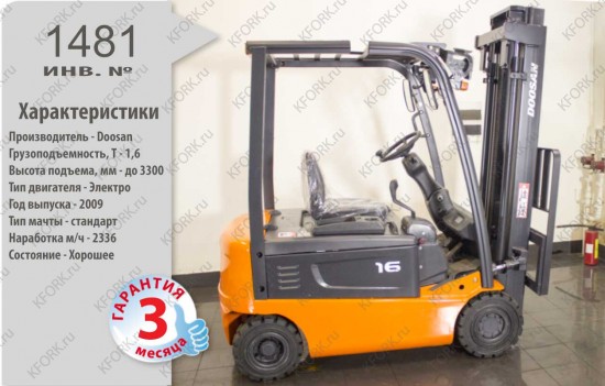 Электрический погрузчик Doosan Б/У с интентарным номером 1481 2009 года выпуска. Состояние - Хорошее. Имеет грузоподъемность 1600 кг. Гарантия: 3 мес или 500 м/час.