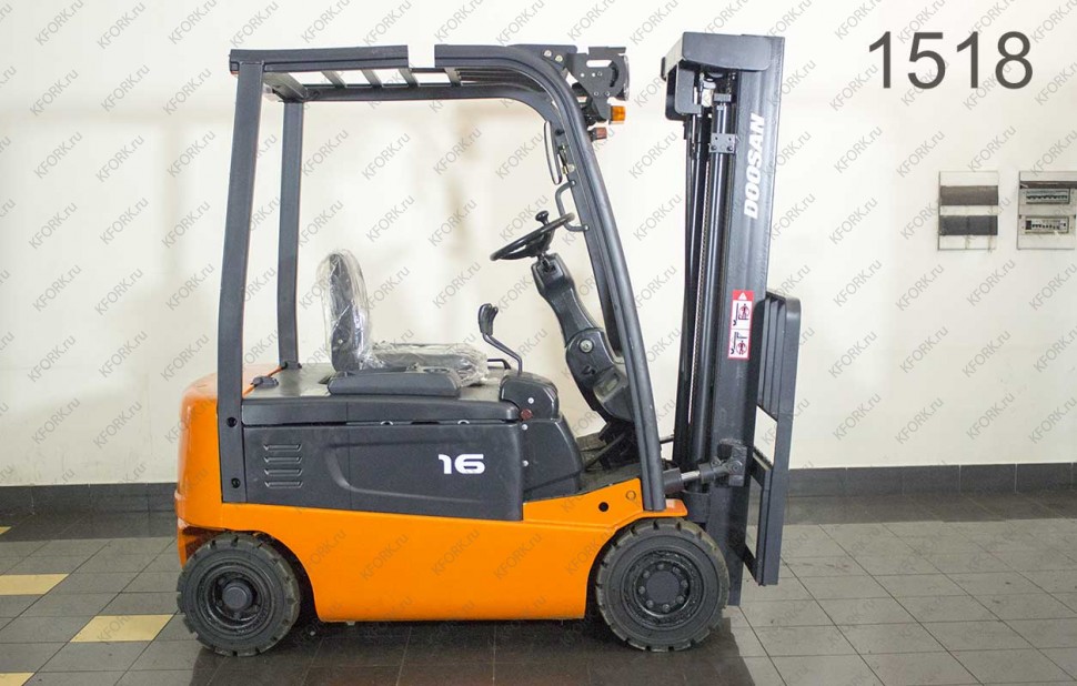 Электрический погрузчик Doosan Б/У с интентарным номером 1518 2011 года выпуска. Состояние - Хорошее. Имеет грузоподъемность 1600 кг. Гарантия: 3 мес или 500 м/час.