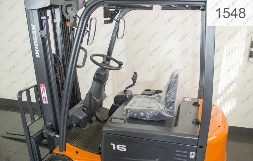 Электрический погрузчик Doosan Б/У с интентарным номером 1548 2012 года выпуска. Состояние - Хорошее. Имеет грузоподъемность 1600 кг. Гарантия: 1 мес или 200 м/час.