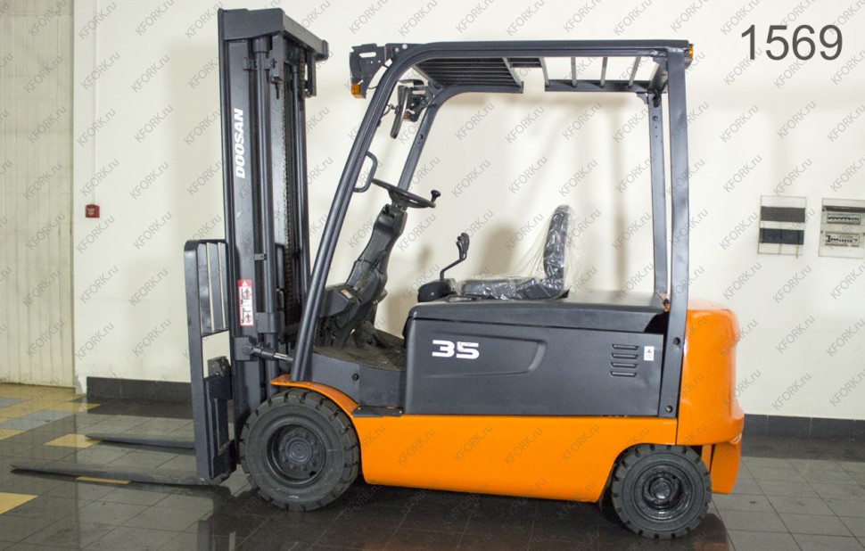 Электрический погрузчик Doosan Б/У с интентарным номером 1569 2007 года выпуска. Состояние - Хорошее. Имеет грузоподъемность 3500 кг. Гарантия: .