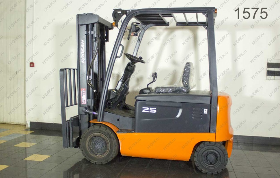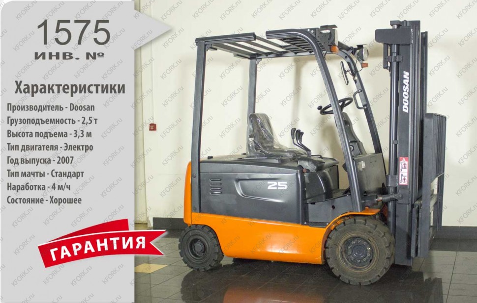 Электрический погрузчик Doosan Б/У с интентарным номером 1575 2007 года выпуска. Состояние - Хорошее. Имеет грузоподъемность 2500 кг. Гарантия: .