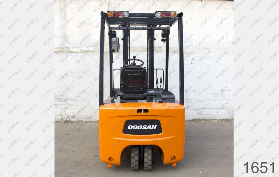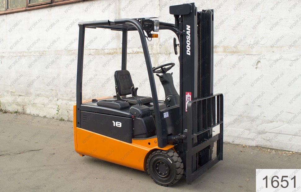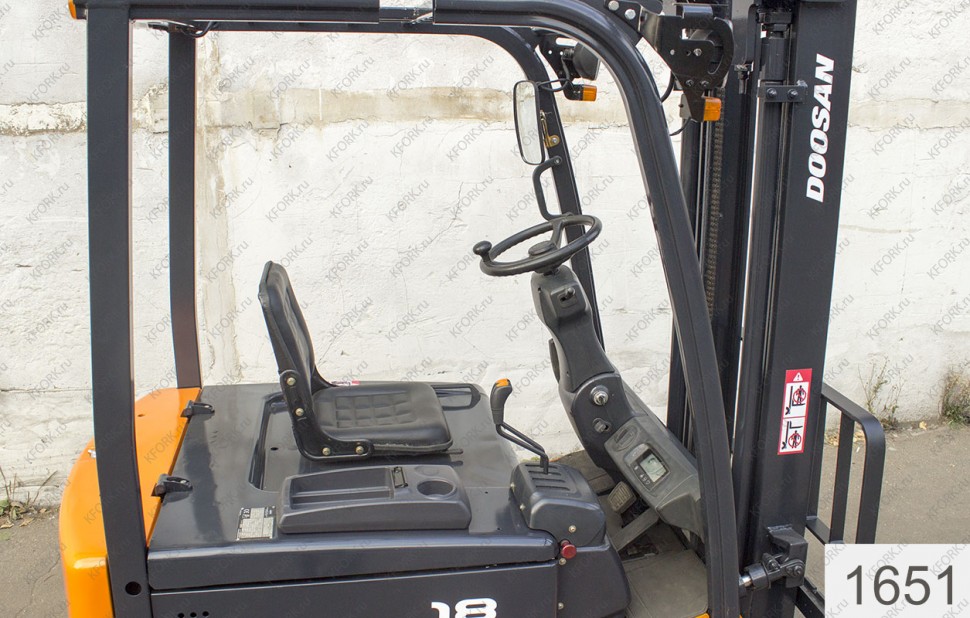 Электрический погрузчик Doosan Б/У с интентарным номером 1651 2013 года выпуска. Состояние - Хорошее. Имеет грузоподъемность 1750 кг. Гарантия: 1 мес или 200 м/час.