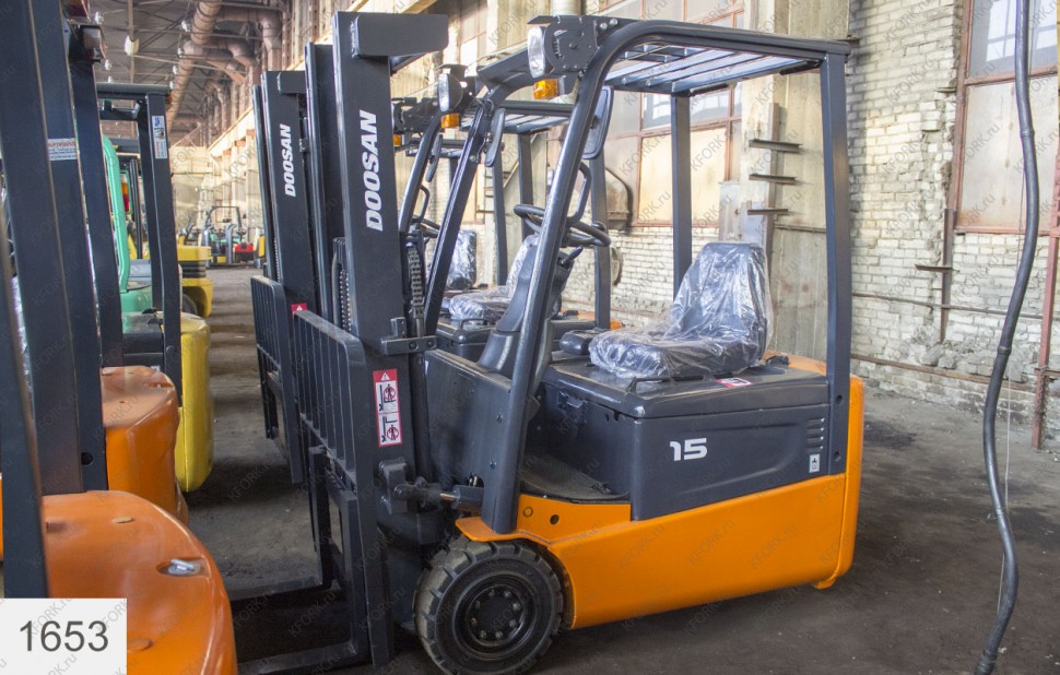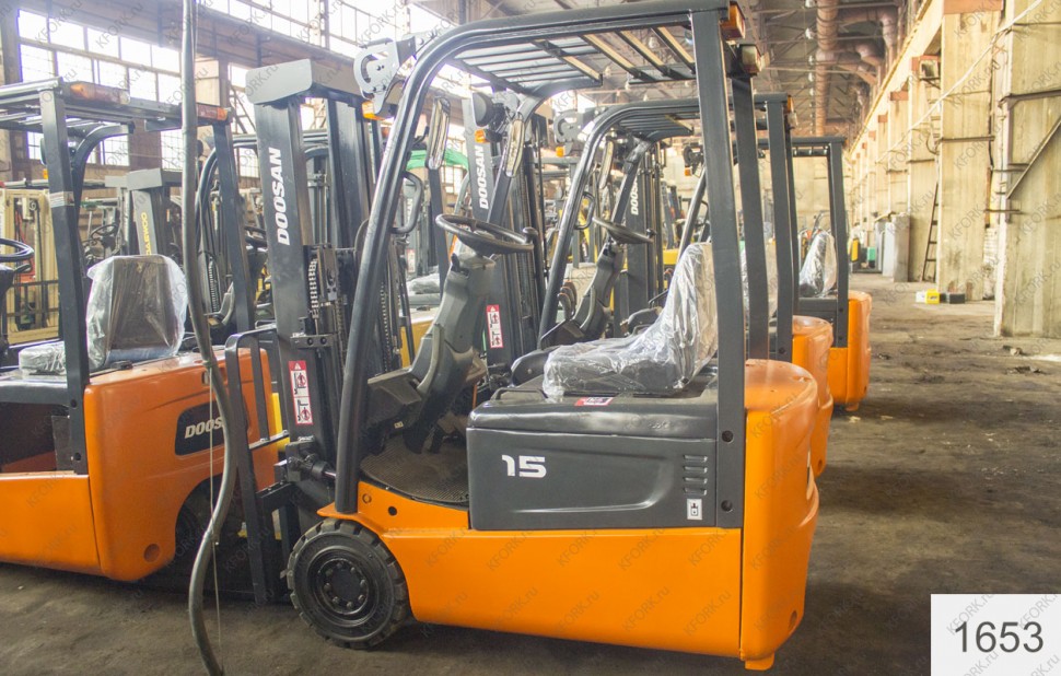 Электрический погрузчик Doosan Б/У с интентарным номером 1653 2012 года выпуска. Состояние - Хорошее. Имеет грузоподъемность 1500 кг. Гарантия: 1 мес или 200 м/час.
