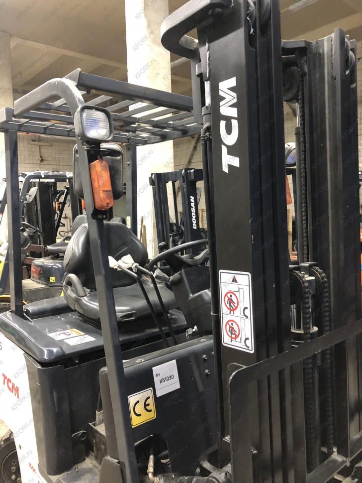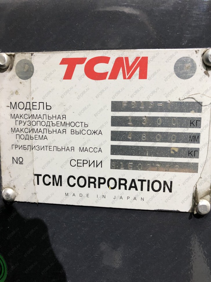 Электрический электропогрузчик TCM FB15-7 с инвентарным номером КМ030 2007 года выпуска. Имеет грузоподъемность 1500 кг. Гарантия: 1 мес или 200 м/час.
