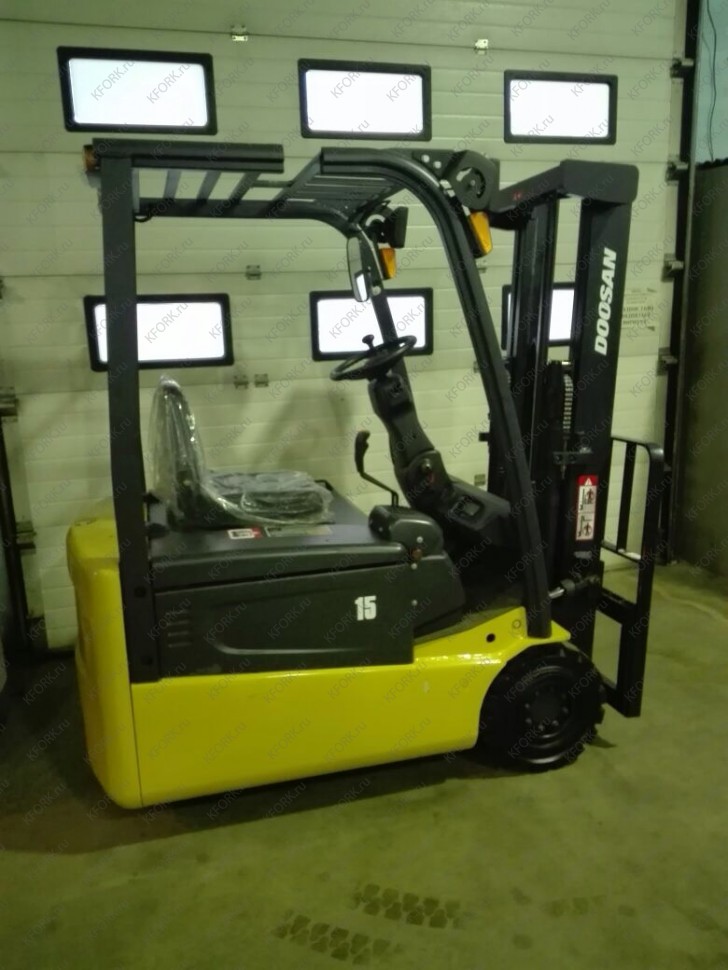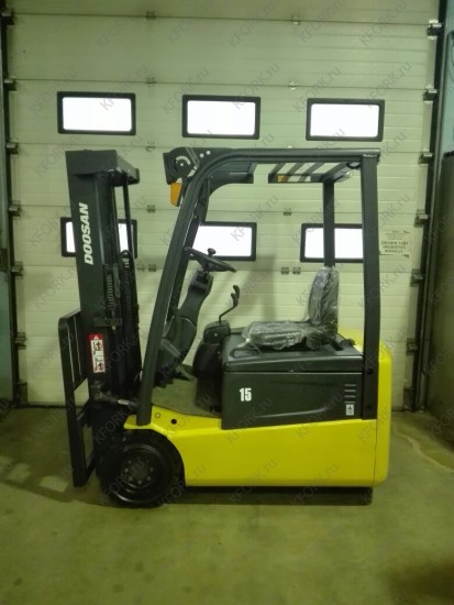 Электропогрузчик вилочный Doosan модели B15T-5 б/у с инвентарным номером K00023 2006 года выпуска. Состояние - отличное. Имеет грузоподъемность 1500 кг. Гарантия: