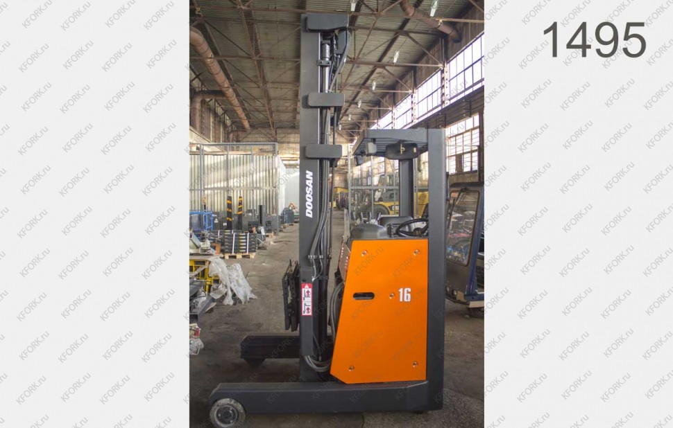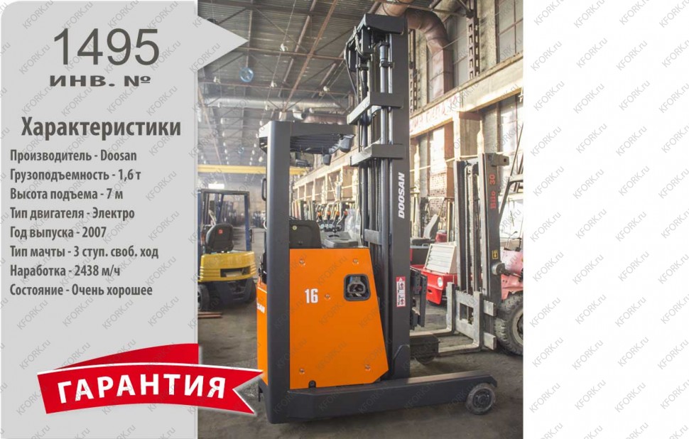 Электрический Ричтрак Doosan Б/У с интентарным номером 1495 2007 года выпуска. Состояние - Хорошее. Имеет грузоподъемность 1600 кг. Гарантия: 1 мес или 200 м/час.