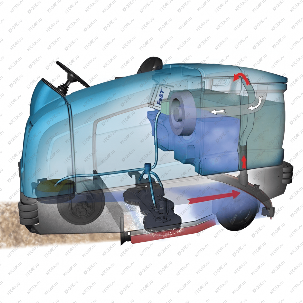 При габаритах 2410 × 1300 × 2120 мм и весе 2223 кг машина демонстрирует отличную проходимость с дорожным просветом 80 мм. Вместительные баки объемом 303 л для чистой воды и 360 л для грязной, а также мусоросборник на 31 л позволяют работать продолжительное время без остановок.
