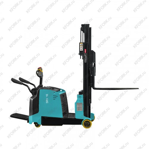 Самоходный штабелер с противовесом PROLIFT PRO грузоподъемность 1600 кг, высота подъёма 3000 мм SRV 1630 способен поднять груз массой 1600 кг на высоту 3000 мм. Специально разработан для осуществления погрузочно-разгрузочных работ, а также перевозки грузов на короткие и средние расстояния. Благодаря наличию противовеса спереди отсутствуют опорные консоли. Данная особенность позволяет разгружать машины с торца и бортов, укладывать товар в несколько ярусов, поднимать груз с пола, а также использовать двухнастильные и нестандартные поддоны с возможностью захвата с любой стороны. Литий-ионная батарея ёмкостью 200 Ач обеспечивает долгую автономную работу оборудования. Модель оборудована двигателем движения мощностью 1,5 кВт и двигателем подъёма 2 кВт. С целью повышения комфорта, безопасности и продуктивности работы оператора оборудование имеет складную платформу и защитные поручни. Платформа оснащена амортизирующей конструкцией. Скорость движения составляет (с грузом/без груза) 5,5/6 км/ч.